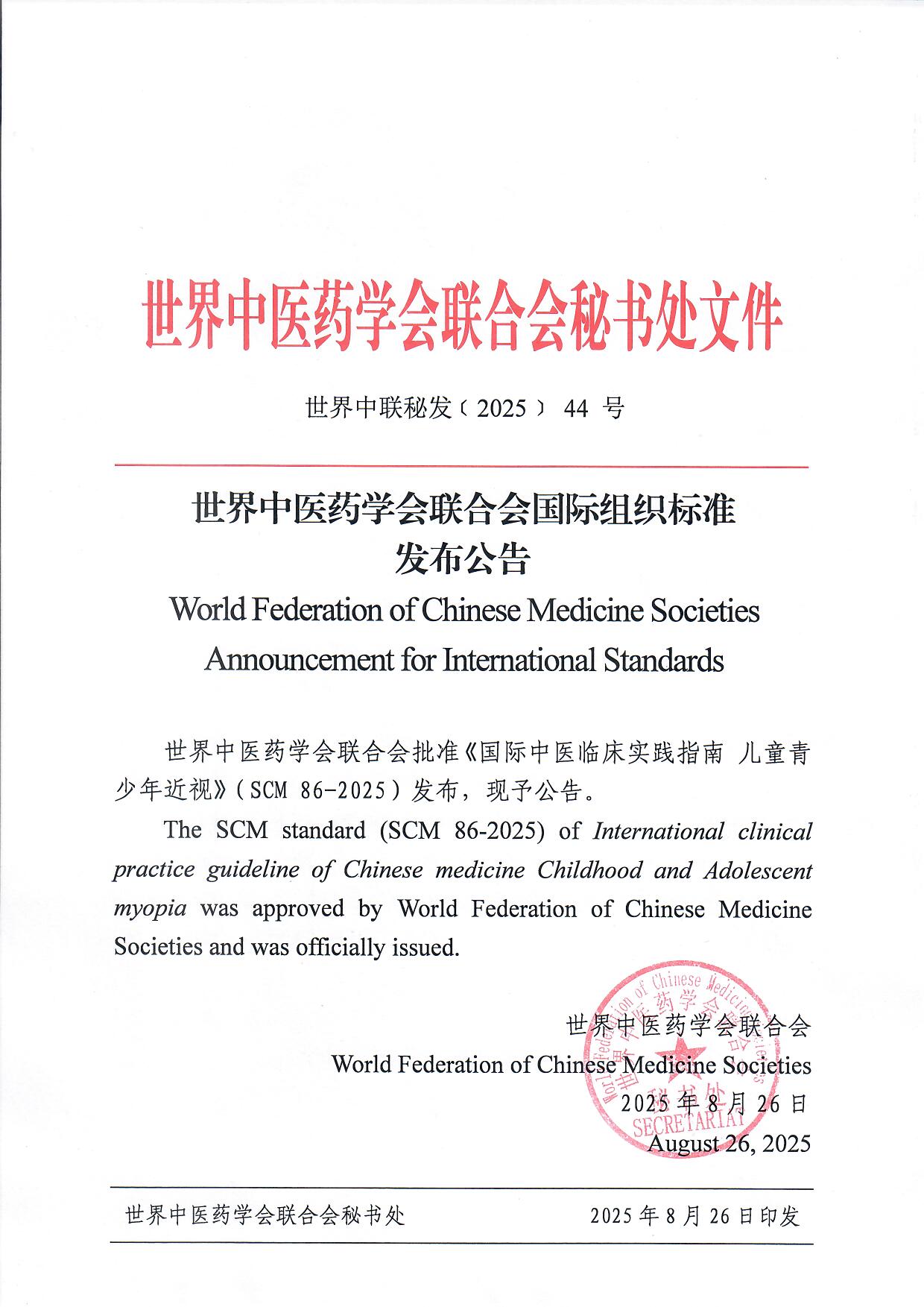 TheSCM standard (SCM 86-2025) of International clinical practice guideline of Chinese medicine Childhood and Adolescent myopiawas approved by World Federation of Chinese Medicine Societies and was officially issued.