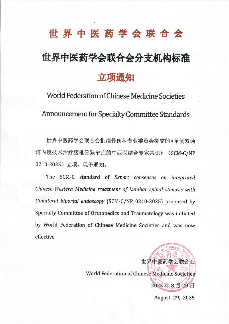 世界中医药学会联合会批准骨伤科专业委员会提交的《单侧双通道内镜技术治疗腰椎管狭窄症的中西医结合专家共识》(SCM-C/NP 0210-2025)立项,现予通知。