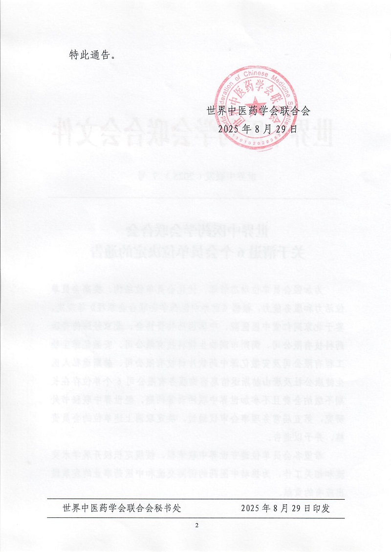 世界中医药学会联合会关于清退6个会员单位决定的通告