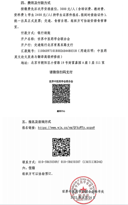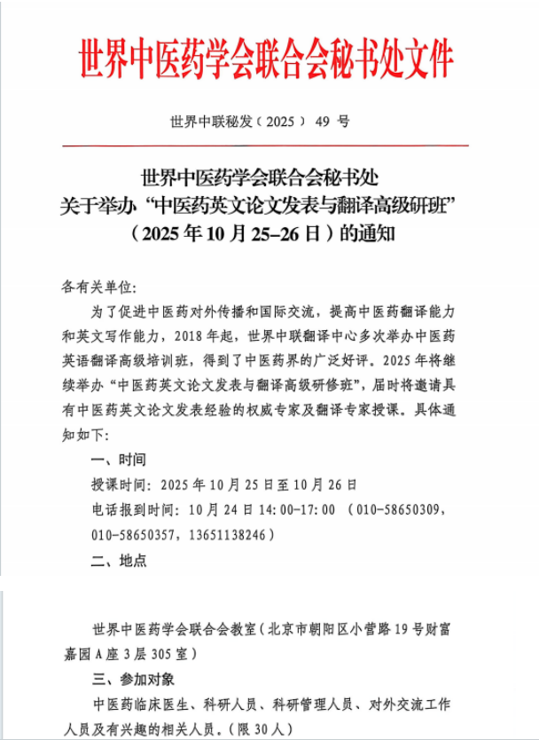 关于举办“中医药英文论文发表与翻译高级研修班”(2025年10月25-26日)的二轮通知