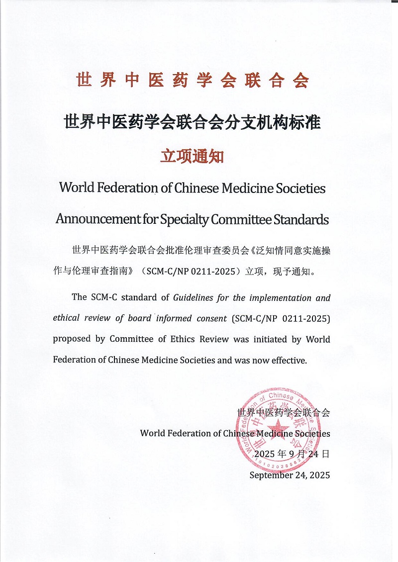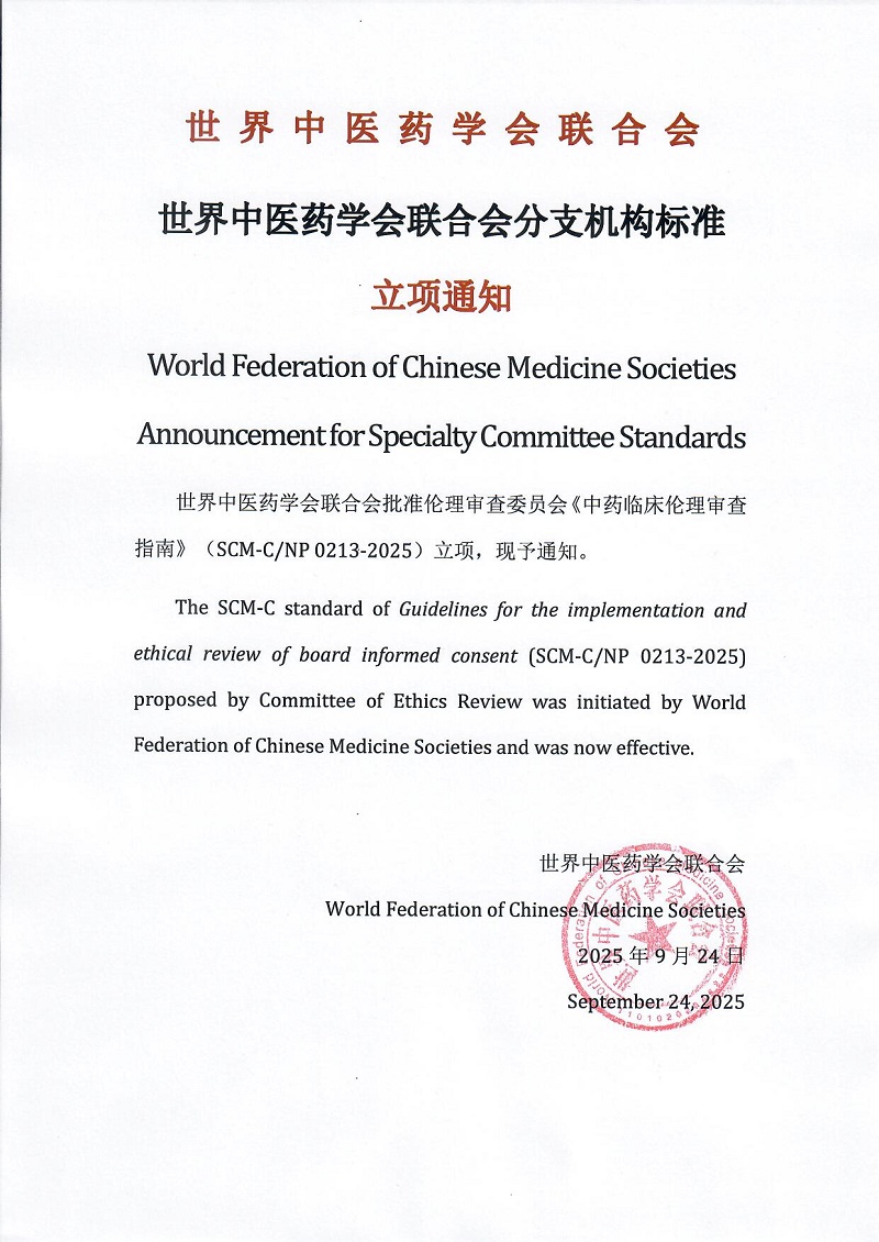 The SCM-C standard of Guidelines for the implementation and ethical review of board informed consent (SCM-C/NP 0211-2025) proposed by Committee of Ethics Review was initiated by World Federation of Chinese Medicine Societies and was now effective.