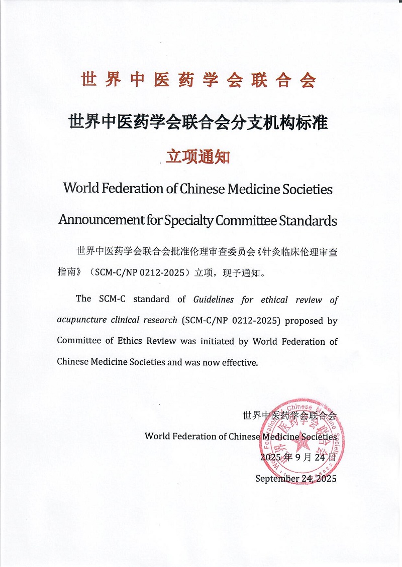 The SCM-C standard of Guidelines for ethical review of acupuncture clinical research (SCM-C/NP 0212-2025) proposed by Committee of Ethics Review was initiated by World Federation of Chinese Medicine Societies and was now effective.