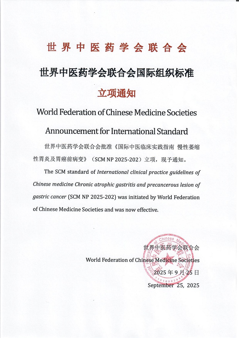 The SCM standard of International clinical practice guidelines of Chinese medicine Chronic atrophic gastritis and precancerous lesion of gastric cancer (SCM NP 2025-202) was initiated by World Federation of Chinese Medicine Societies and was now effective.
