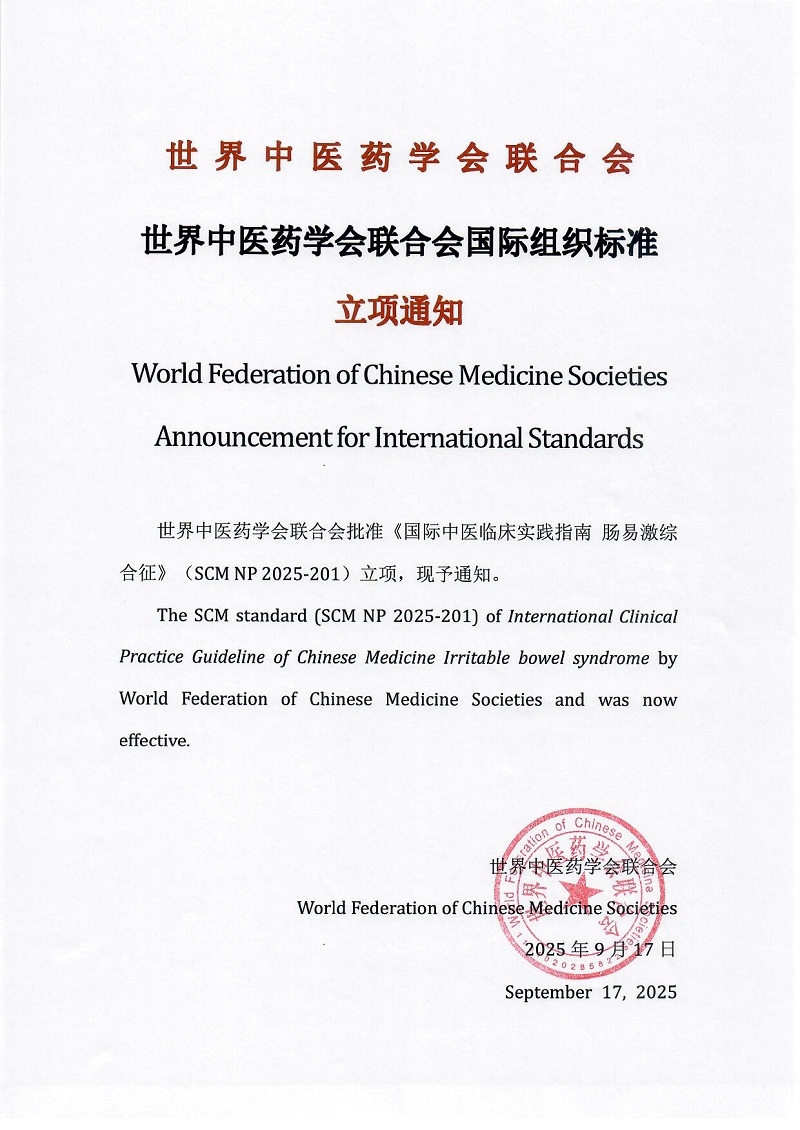 The SCM standard (SCM NP 2025-201) of International Clinical Practice Guideline of Chinese Medicine Irritable bowel syndrome by World Federation of Chinese Medicine Societies and was now effective.