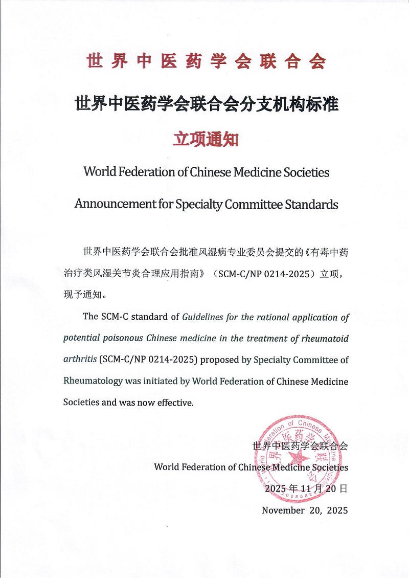 The SCM-C standard of Guidelines for the rational application of potential poisonous Chinese medicine in the treatment of rheumatoid arthritis (SCM-C/NP 0214-2025) proposed by Specialty Committee of Rheumatology was initiated by World Federation of Chinese Medicine Societies and was now effective.