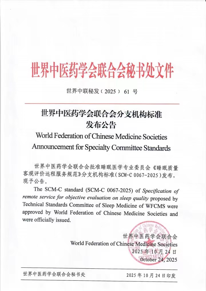 The SCM-C standard (SCM-C 0067-2025) of Specification of remote service for objective evaluation on sleep quality proposed by Technical Standards Committee of Sleep Medicine of WFCMS were approved by World Federation of Chinese Medicine Societies and were officially issued.