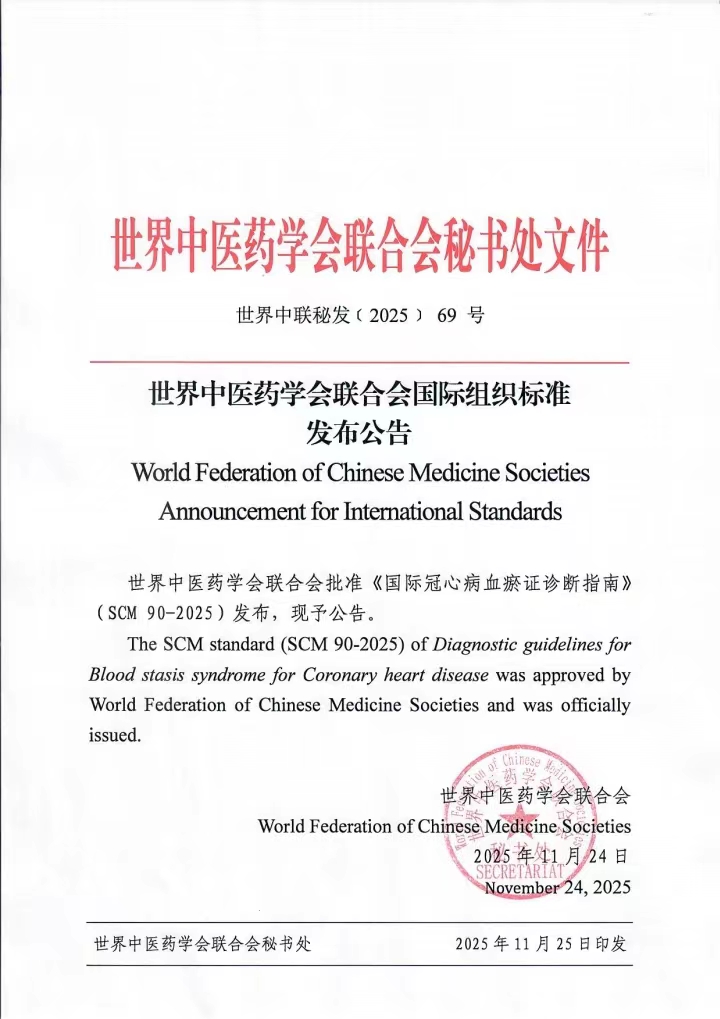 The SCM standard (SCM 90-2025) of Diagnostic guidelines for Blood stasis syndrome for Coronary heart disease was approved by World Federation of Chinese Medicine Societies and was officially issued.