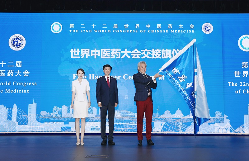 在庄严的会旗交接环节,本届大会承办方澳大利亚中医药慈善基金会与下届大会承办方新加坡中医师公会完成了世界中医药大会会旗交接。