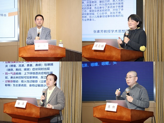 王立新做了题为《几种儿科常见病的中医外治诊疗》的报告,王龙做了题为《如何打造具有独特文化体系的小儿推拿专科》的报告,吴大嵘做了题为《儿童体质与健康管理技术》的报告,栾志勇做了题为《小儿推拿在小儿外科术后促进肠功能快速恢复的临床应用》的报告,宋飞做了题为《赵鉴秋教授运用三字经派取穴手法分享》的报告,周奕琼做了题为《张素芳教授近视推拿24步》的报告,陆萍做了题为《鼻炎哮喘综合征》的报告,陈红做了题为《小儿感冒的手法配伍》的报告,何玉华做了题为《小儿推拿治疗脾虚综合征的临床应用》的报告,李付根做了题为《疏风止痉推拿法治疗小儿多发性抽动症》的报告,王建红做了题为《孙德仁少儿健脾推拿术在调理儿童自闭症中的临床实践》的报告,王喜臣做了题为《小儿推拿现状的调查情况汇报》的报告,共计12位专家为大会做了报告分享。