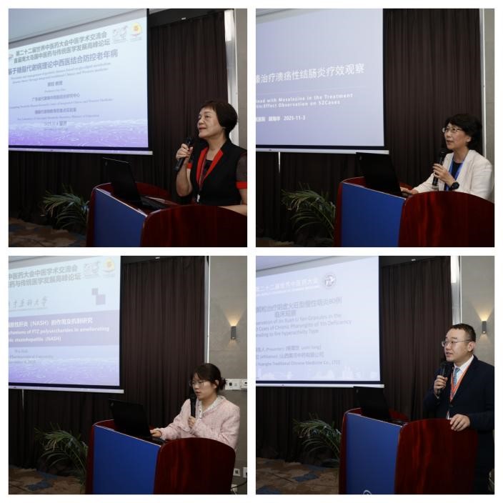 在药物研究方面,学者们展示了运用现代科学研究方法探索传统方剂作用机制的成果。广东药科大学郭姣教授团队发表了基于糖脂代谢病理论中西医结合防控老年病的研究,吴佳莉研究员探讨了复方贞术调脂方多糖改善非酒精性脂肪性肝炎的作用及机制。日照市中医医院胡海华主任分享了正阳汤联合美沙拉嗪治疗溃疡性结肠炎52例疗效观察,山西黄河中药有限公司总经理杨履世报告了金玄利咽颗粒治疗阴虚火旺型慢性咽炎80例临床观察,为传统方剂的现代应用提供了循证依据。