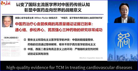 在学术主旨报告环节,中国工程院院士吴以岭教授线上参会,并作题为《络病理论体系构建与创新转化》的学术报告,重点分享了络病理论创新转化成果以及脉络学说指导血管病变防治,气络学说指导神经、内分泌、免疫系统疾病防治,气络学说精神气理论指导抗衰老研究取得的最新科研突破,引发了海内外与会专家的热烈反响。