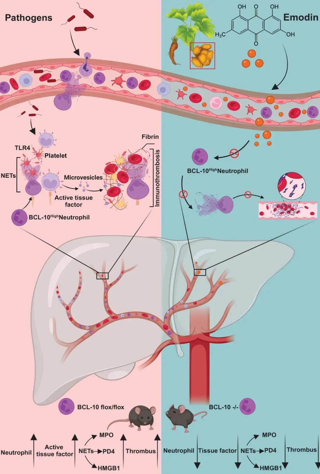 在本研究中,研究团队发现来源于中药大黄的一种强效的蒽醌类生物活性化合物——大黄素(Emodin),通过靶向并抑制BCL-10的表达,调控BCL-10/MALT1复合物,抑制NF-κB活化,显著缓解脓毒症诱导的细胞因子风暴和凝血异常,并显著抑制NETs形成,阻断炎症和凝血系统的过度激活,从而为中医药干预脓毒症干预提供了一个关键机制。