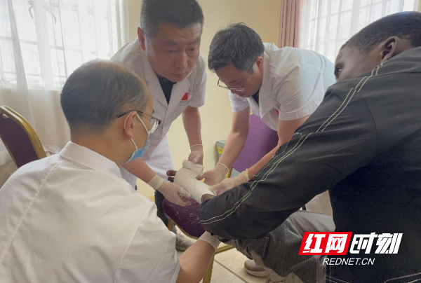 面对伤情,中国(湖南)第22批援津医疗队中医骨科专家张雄副主任医师迅速进行了综合评估,认为此类骨折完全可以通过手法整复术得以治疗。在医疗队副主任医师肖志强、周浩、熊熙的协助下,他运用中医传统的手法整复术,对骨折部位进行复位。随着中国医生的精准操作,患者原本扭曲的脚部很快恢复了平整,疼痛也得到了明显缓解。紧接着,医护人员迅速为患者进行了石膏固定,确保骨折部位能够稳定愈合。