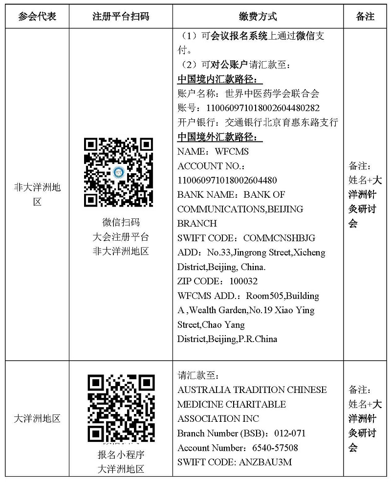 注册费优惠价:US$600, AU$1000.仅限参加大洋洲中医药针灸学术研讨会的代表。