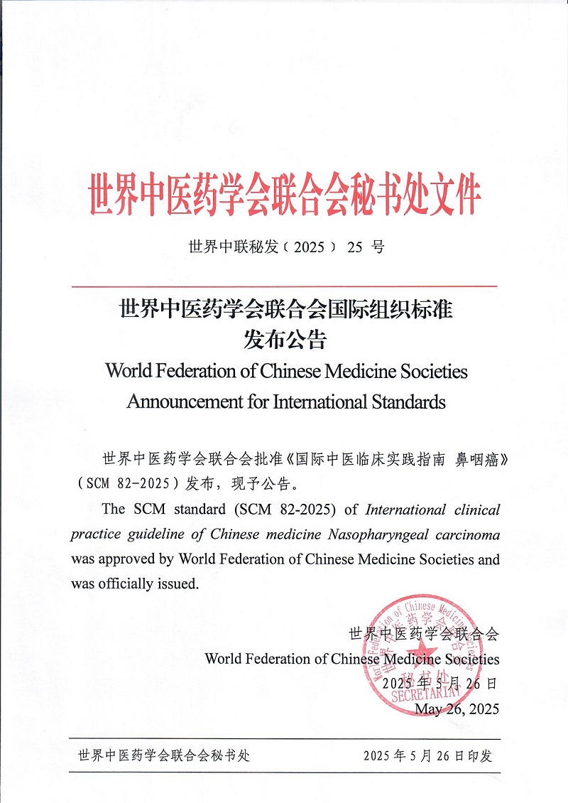 The SCM standard (SCM 82-2025) of International clinical practice guideline of Chinese medicine Nasopharyngeal carcinoma was approved by World Federation of Chinese Medicine Societies and was officially issued.