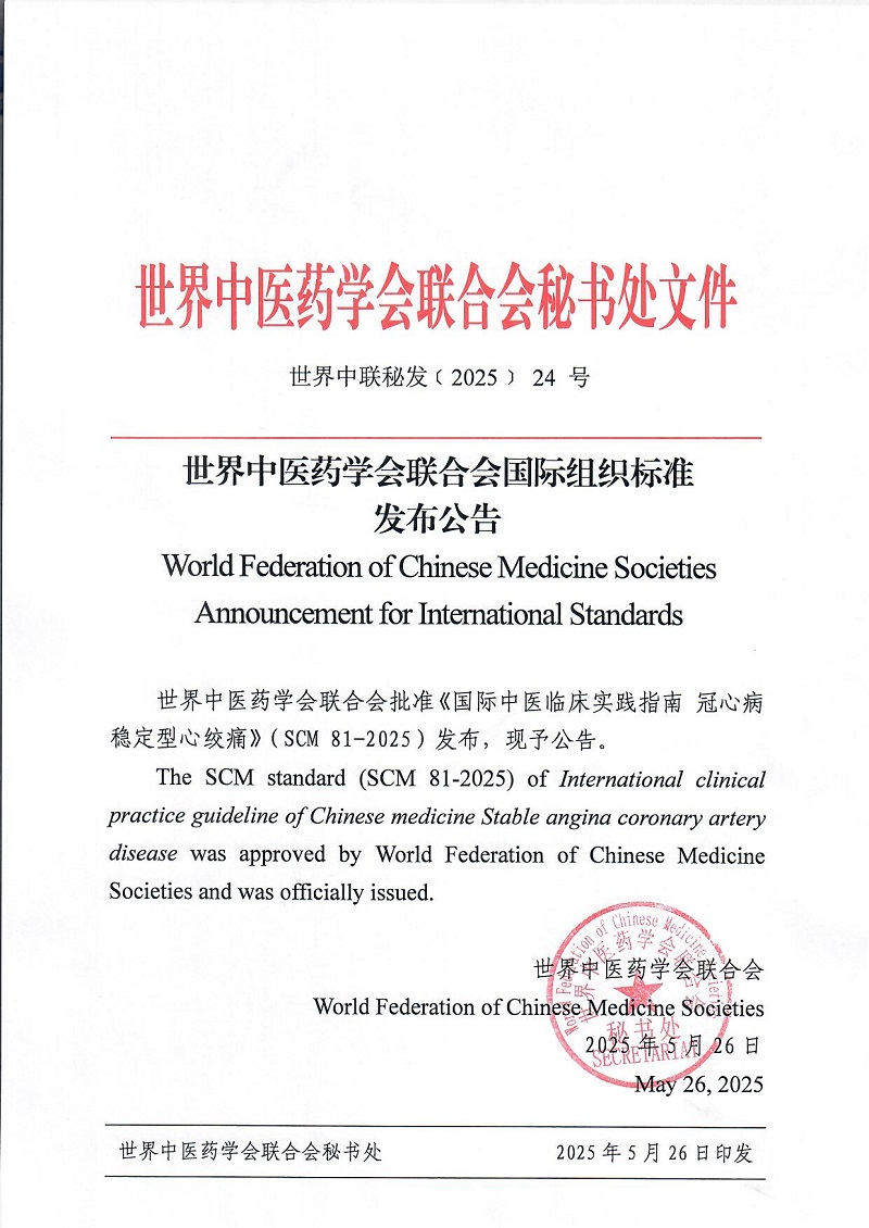 世界中医药学会联合会批准《国际中医临床实践指南 冠心病稳定型心绞痛》(SCM 81-2025)发布,现予公告。