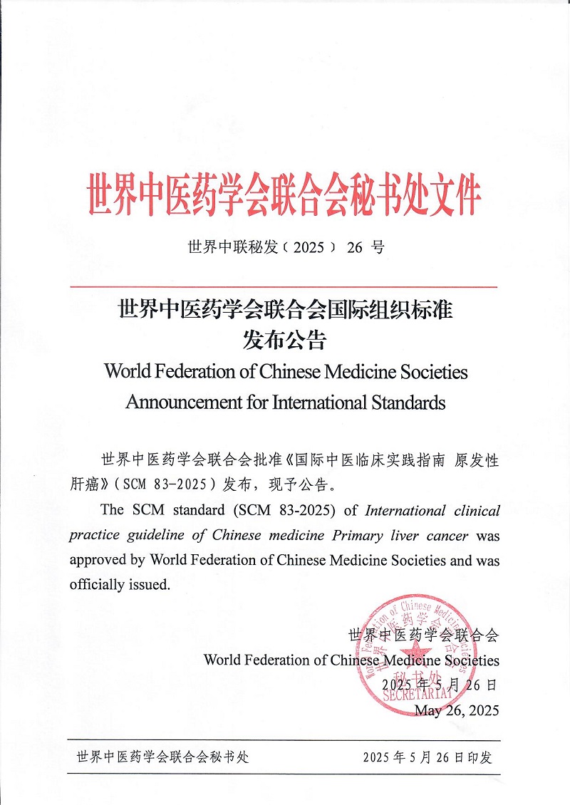 The SCM standard (SCM 83-2025) of International clinical practice guideline of Chinese medicine Primary liver cancer was approved by World Federation of Chinese Medicine Societies and was officially issued.