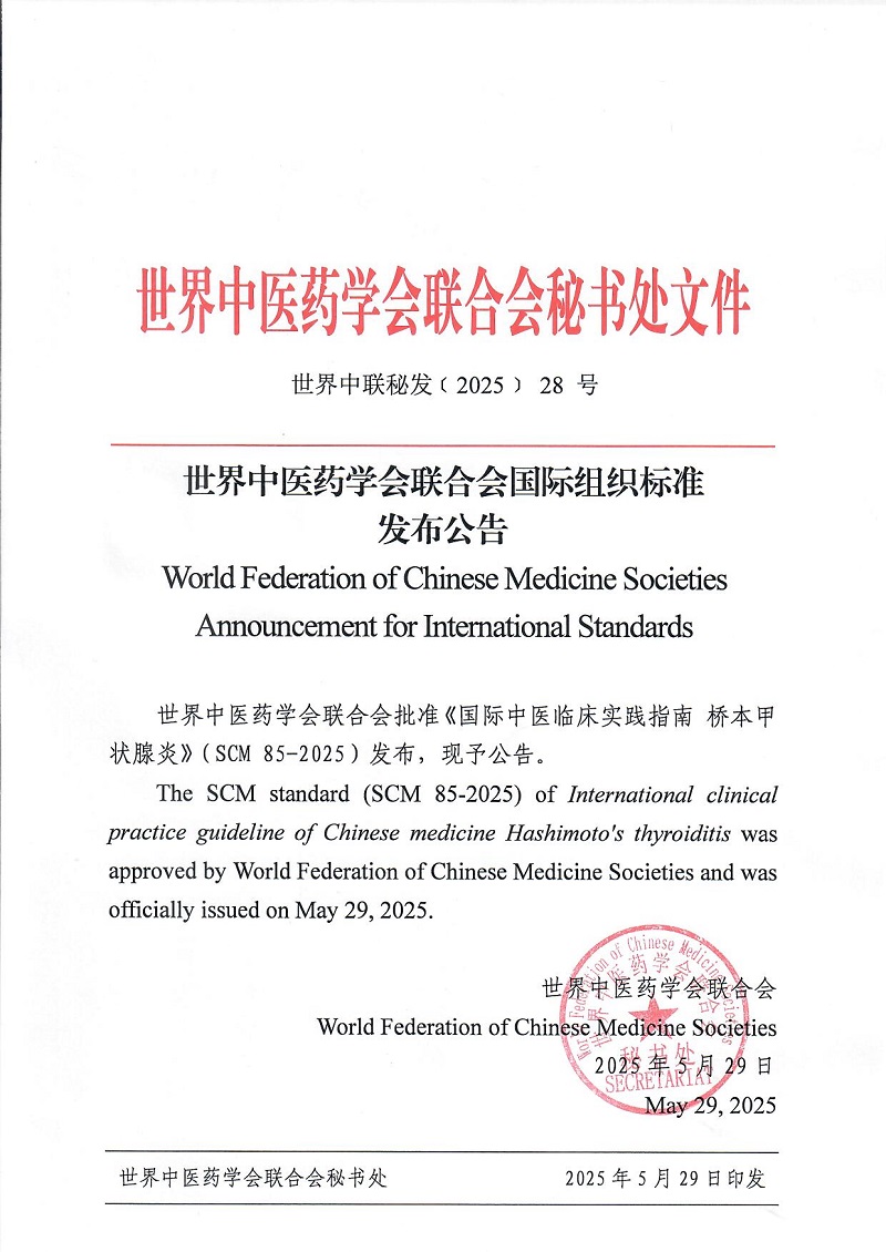 The SCM standard (SCM 85-2025) of International clinical practice guideline of Chinese medicine Hashimoto's thyroiditis was approved by World Federation of Chinese Medicine Societies and was officially issued on May 29, 2025.