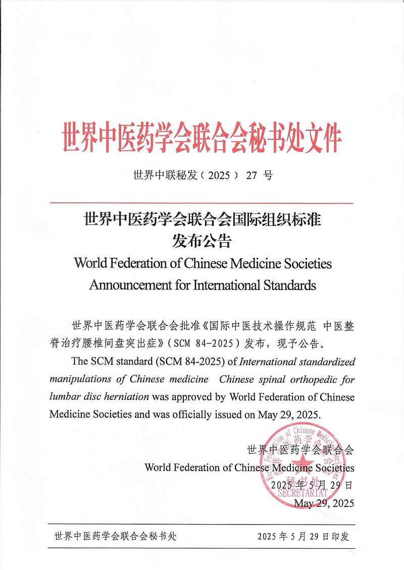 The SCM standard (SCM 84-2025) of International standardized manipulations of Chinese medicine Chinese spinal orthopedic for lumbar disc herniation was approved by World Federation of Chinese Medicine Societies and was officially issued on May 29, 2025.