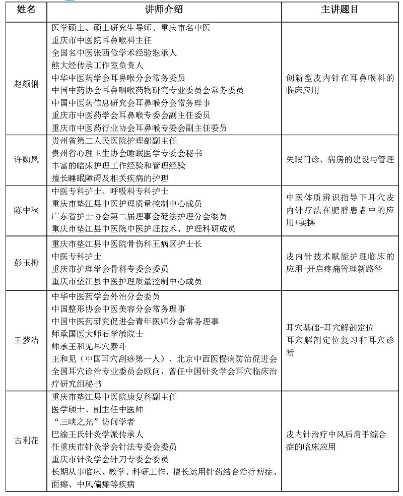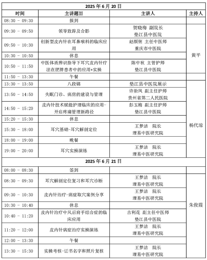 为响应并落实《国家中医药十四五发展规划》,提升基层中医药服务能力,推广中医适宜技术,使之受益于大众健康,促进皮内针疗法更加广泛应用于临床,现定于2025年6月20日—6月21日举办 “2025年第八期皮内针培训班(重庆站)-皮内针疗法在临床常见病的应用”,本次培训采用线上线下相结合的方式,现将有关事宜通知如下:
