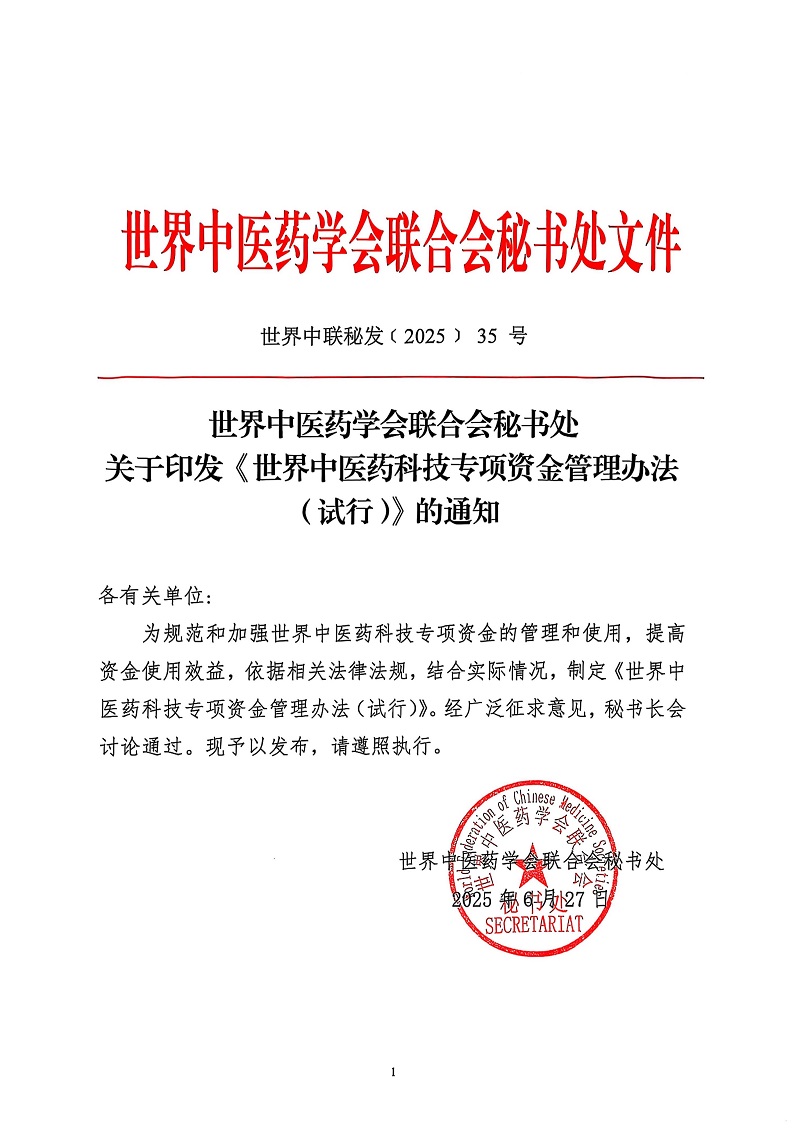 世界中医药学会联合会秘书处关于印发《世界中医药科技专项资金管理办法(试行)》的通知