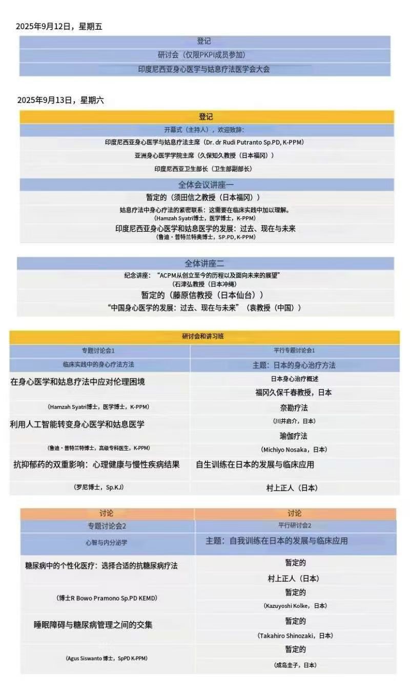 中医心身医学从《黄帝内经》提出“天人合一、形神合一”的整体生命观以来,至宋代陈言《三因极一病证方论》将七情致病作为内因进行单独研究,标志着中医心身医学的诞生,早于西方心身医学出现近800年,历代医家不断对“天人合一、形神合一”的整体观进行着理论与临床实践的传承和发展,从药物治疗到针灸、心理疏导等非药物治疗,皆向世界展示着中医学的特色与魅力。为弘扬中医“天人合一、形神合一”整体观的原创理论体系及丰富的临床经验,推广具有中医传统特色的绿色治疗方案,扩大我国在国际心身医学领域的影响力,第20届亚洲心身医学大会中医心身医学论坛将于2025年9月在印度尼西亚日惹召开。