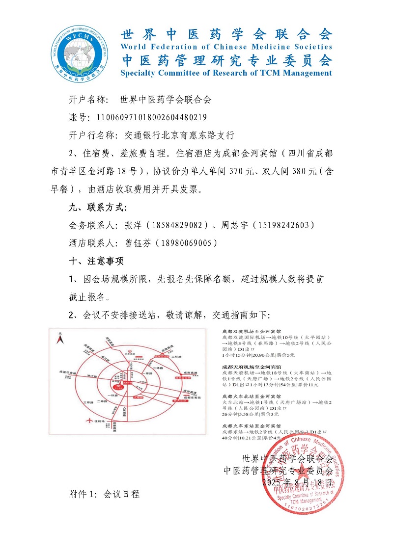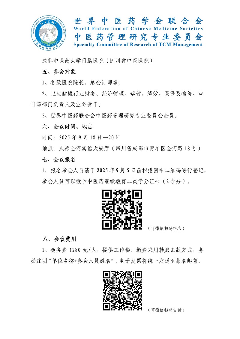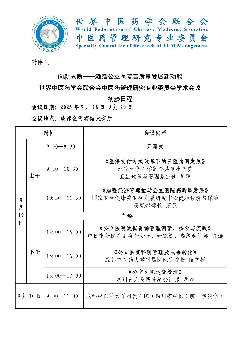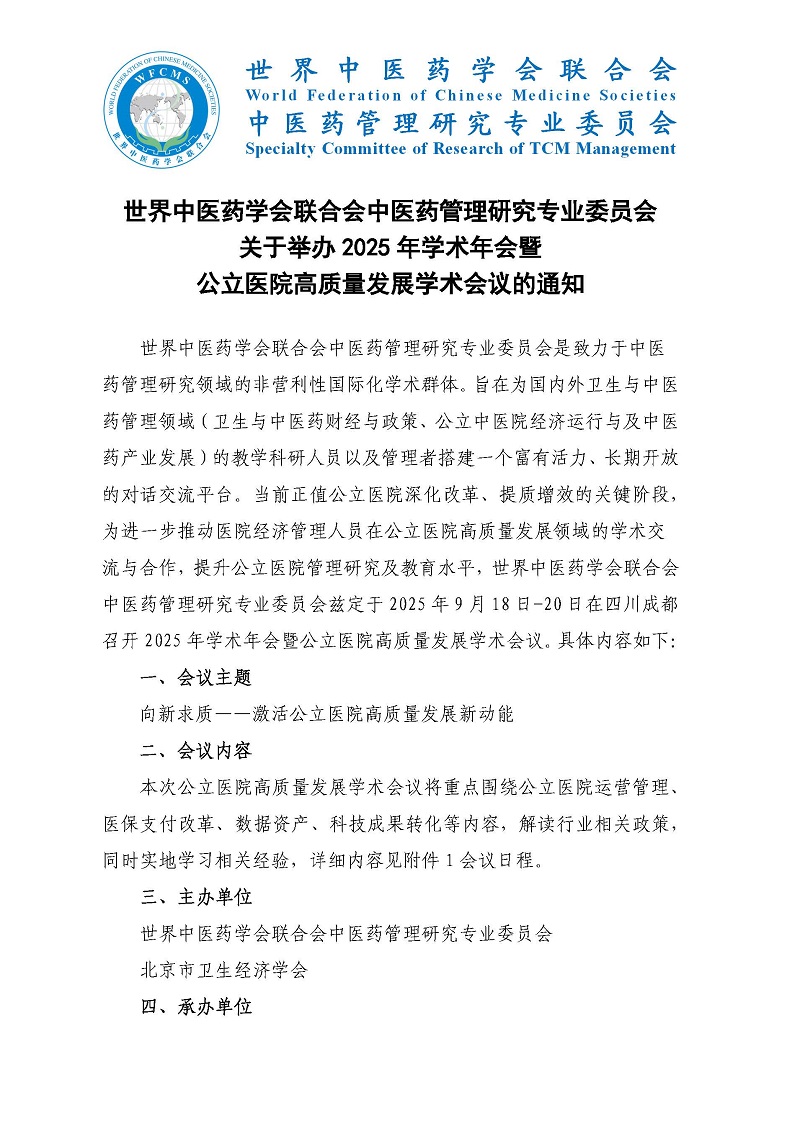 世界中医药学会联合会中医药管理研究专业委员会关于举办2025年学术年会暨公立医院高质量发展学术会议的通知