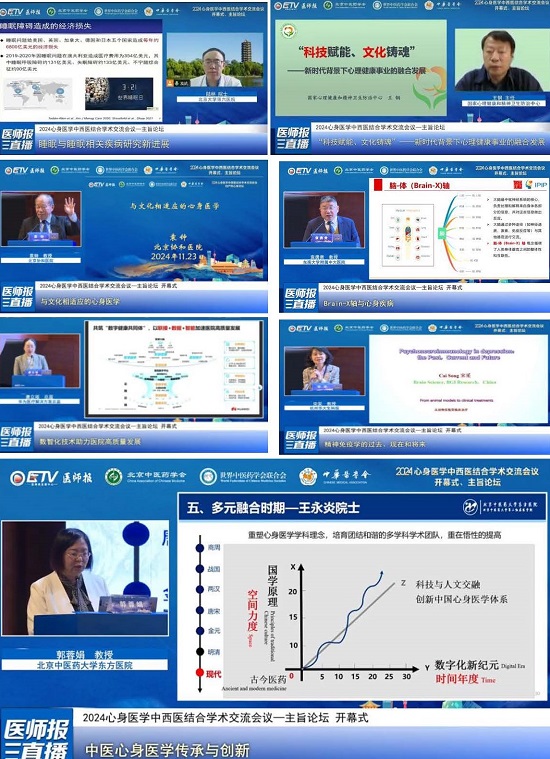 2024年11月22-24日,由世界中医药学会联合会心身医学专业委员会、中华医学会心身医学分会、北京中医药学会心身医学专业委员会、北京中医药大学东方医院及北京中医药薪火传承“新3+3”工程王永炎“三名”传承工作室联合举办的“2024年心身医学中西医结合学术交流会议”以线上线下相结合的形式在北京盛大召开。本次大会以“中西合璧,守护心身”为主题,除主旨论坛外,还有设有国学与心理健康论坛、抑郁论坛、失眠论坛、焦虑及躯体化论坛、消化心身论坛、双心心身论坛、儿童青少年心身论坛、妇产科心身论坛、老年心身论坛、皮肤心身论坛、肿瘤心身论坛、国际心身论坛、王永炎院士薪火传承与创新论坛,共计14个专题分论坛,共邀请到海内外100余位来自各个领域的专家学者,就深耕的不同领域,从中西医结合方面、多学科融合视角分享了其对心身疾病诊疗经验、最新研究成果、发展趋势等,极大地推进整个心身医学领域的临床、科研、教学、产业等方面的变革与发展。本次大会通过医师报TV等多家媒体平台同步直播,累计播放量达470万余人次,广泛地传播了心身医学赋能人们心身健康的相关知识及技能,引发了社会各界对心身医学事业的广泛关注。