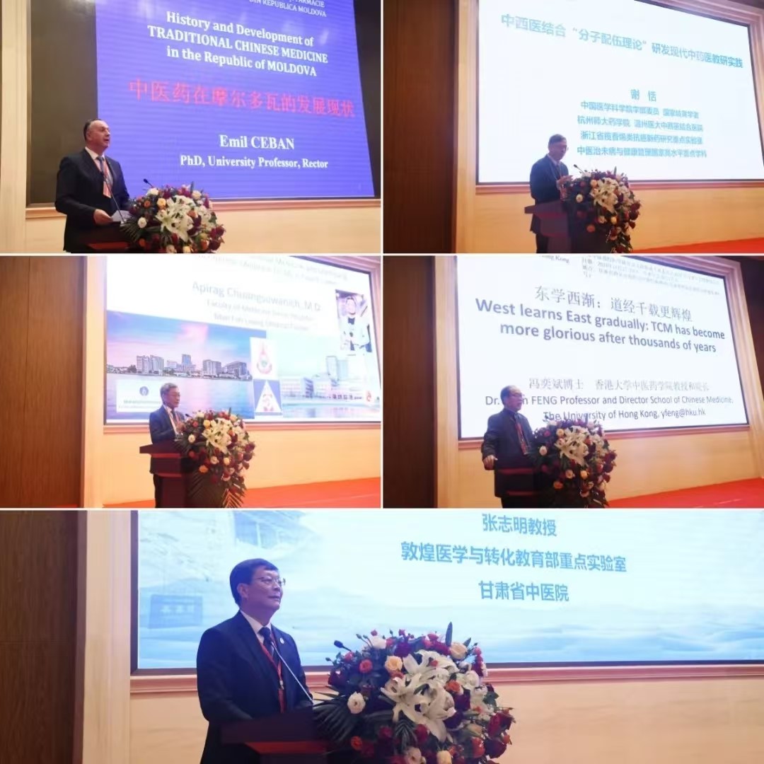 上午场专家报告,摩尔多瓦国立医药大学校长Emil Ceban,杭州师范大学药学院院长谢恬,泰国皇太后大学医学院院长Apirag Chuangsuwanich,香港大学中医药学院院长冯奕斌,甘肃省中医院院长张志明分别以“History and development of Traditional Chinese Medicine in the Republic of Moldova.”“中西医结合“分子配伍理论”研发现代中药的医教研实践”“The integration of Thai Traditional Medicine and Dunhuang Traditional Chinese Medicine (TCM) in health care”“东学西渐:道经千载更辉煌”“臆说敦煌医学”为题作了精彩报告。