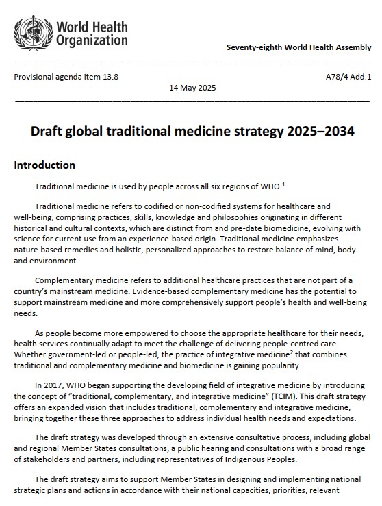世界中联支持第78届世界卫生大会审议通过2025-2034世界卫生组织传统医学战略