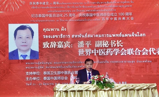 潘平副秘书长在开幕式致辞中表示,泰国中医师总会历经百年,为泰国中医药发展和人民健康福祉做出杰出贡献。2017年泰国中医师总会成功承办第十四届世界中医药大会,同年成立泰国中医科学院。2018年,世界中医药学会联合会在泰国中医科学院设立“中医临床研究国际合作中心”,推动中医药国际标准研究制定和国际传播。新冠疫情期间,“五老御瘟丹”发挥重要作用,研发团队获“第七届中医药国际贡献奖”。