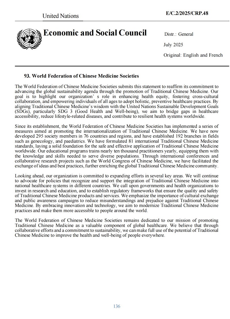 书面声明中,世界中联对中医药维护确保健康的生活方式,促进各年龄段人群的福祉进行叙述,就世界中联已做工作和促进健康公平、推动跨文化合作、鼓励各年龄段人群采用整体预防保健实践方面并始终致力于推动中医药成为全球医疗保健的重要组成部分这一使命进行阐述。